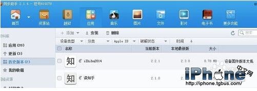 2、打開同步助手並且連接好蘋果設備。找到需要安裝舊版本的應用。點擊歷史版本。