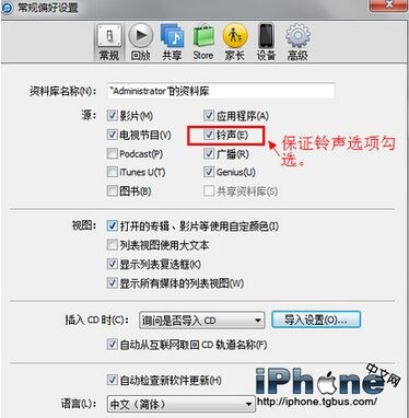在偏好設置選項卡裡,把鈴聲選項勾選。這是為了保證鈴聲選項能出現。沒有前面3個步驟,以後鈴聲的列表沒有地方查詢