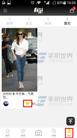1)首先先打開有范,進去之後點擊【我的】,接著在喜歡頁面點擊【心形】就可以了。(如下圖)