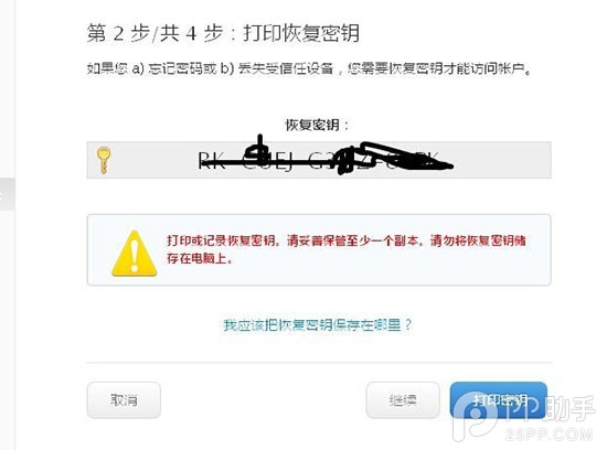 7. 設備驗證成功之後,我們會得到一個非常非常重要的恢復密鑰,最好將它抄錄在一個或者幾個不會丟失的本子上,留著以後備用。然後,系統將會要求我們輸入恢復密鑰以確認我們已經擁有了密鑰。