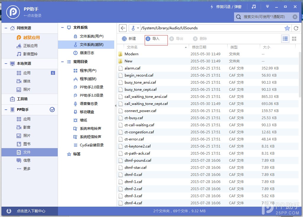 3.打開PP助手電腦版,依次進入【文件】-【越獄系統文件】,打開路徑:System/Library/Audio/UISounds,{先備份原有的撥號單}