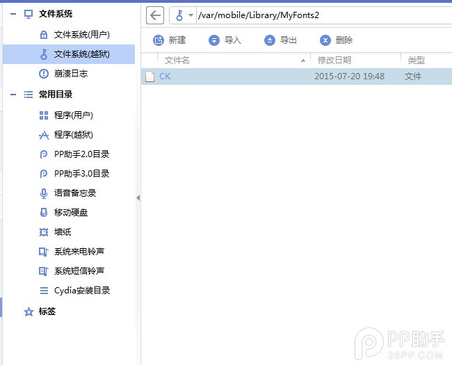 然後訪問iPhone越獄路徑:/var/mobile/Library/MyFonts2 (剛裝的可能不存在這個路徑,需要自己創建)