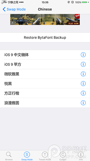 此前我們有教大家幾個替換字體的方法,其中主要有兩個,一個將下載好的字體覆蓋系統路徑。另一個就是在Cydia中下載字體插件bytafont2,然後再下載相關字體,然後在bytafont2中切換字體。兩者各有各的好處,前者能夠節省空間,但是切換起字體來比較麻煩,如果你沒有保存原先字體的話並想換過來的時候簡直想哭,後者僅能使用Cydia上現成的字體,如果你在別的發現好看的字體包,則無法通過那個方法替換上去。如果能將兩者結合起來該多好。