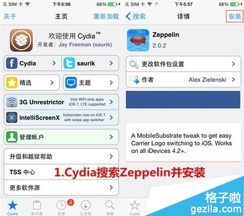 1 、打開 Cydia ,依次點開管理 - 軟件源 - 編輯 - 添加“ apt.feng.com ”(或“ apt.modmyi.com ”等其它源),然後搜索 Zeppelin 進行安裝。