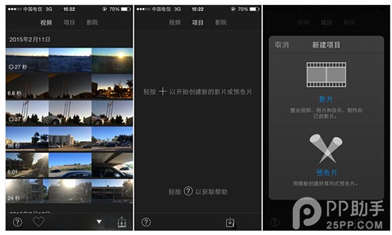 iMovie現在可以直接在Apple Store中下載,這個應用挺大,最好是連著WiFi下載。這個應用其實比較容易上手,當你進入後,手機中的視頻就會被自動讀取出來了。iMovie主要分為三塊:視頻、項目、影院。