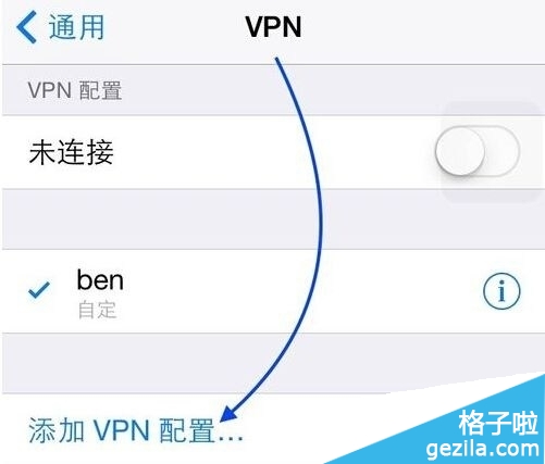 4、在 VPN 的設置界面裡點擊“添加 VPN 配置”一欄,如圖所示