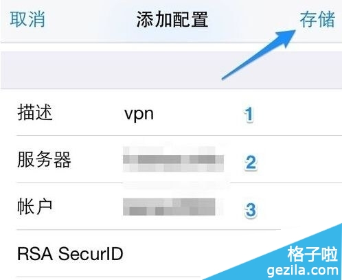 6、我這裡以 PPTP 類型為例,依次輸入如下圖標識的描述,服務器,帳戶和密碼,然後點擊“存儲”按鈕。