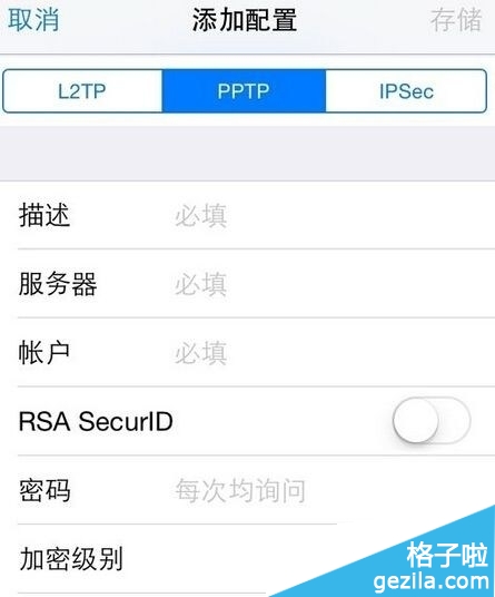 5、VPN 有三種類型,分別為 L2TP、PPTP 和 IPSec 三種。根據你自己當前的 VPN 賬戶的類型來設置。