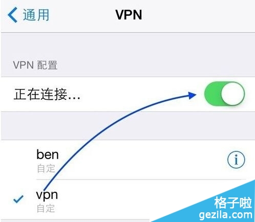 7、隨後選擇剛剛配置的 VPN 連接,再點擊連接開關,進行 VPN 的網絡連接。