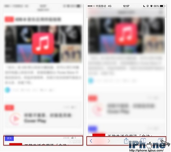 從iiOS7開始,Safari在你向下滾動頁面時會把底欄的工具欄隱藏起來,給你留下更多的網頁內容浏覽空間。當你需要呼出它時,不需要滾動頁面,可以輕點屏幕的最底部。
