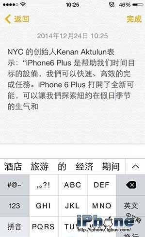 在任意應用中輸入一段文字,比如iOS8的備忘錄應用。完成輸入後,長按字體出現編輯功能,我們可以通過移動大頭針完成文字選擇,這時可以看到編輯工具條上出現了“簡繁”切換功能。選擇該功能後,文字自動切換成繁體字,可以注意到我們的“們”字。