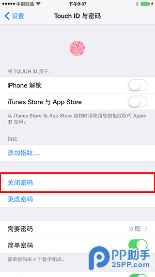 2. 越獄前務必在設備”設置”— ”Touch ID與密碼”— ”關閉密碼”,關閉鎖屏密碼。