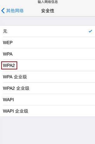 5.然後輸入無線網絡的WiFi名稱,選擇“安全性”,如上文所述,這裡可以選擇WPA也可以選擇WPA2,為了安全,推薦選擇WPA2。在iPhone上,WPA和WPA2實際上是指的WPA-PSK和WPA2-PSK,PSK意思是個人共享密鑰,也就是常說的“WPA 個人”和“WPA2 個人”,這是為了與企業級認證相對應的說法。安卓手機有WPA/WPA2混合安全性可選,但iPhone是沒有的,所以在設置iPhone之前,您需要精確的知道路由器設置的安全性方式。