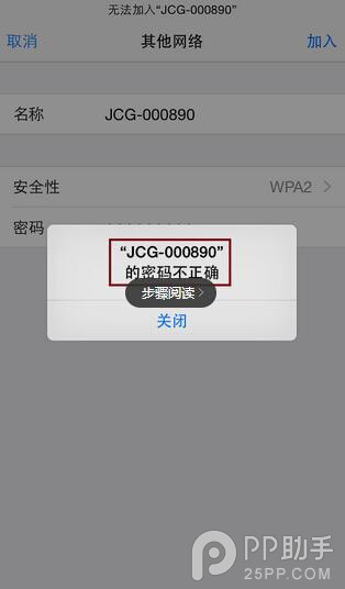 7.如果安全性選擇錯誤或者密碼輸入不正確,iPhone會給出錯誤提示,這樣您需要重新選擇正確的安全性並且輸入正確的WiFi密碼才能再次嘗試連接。