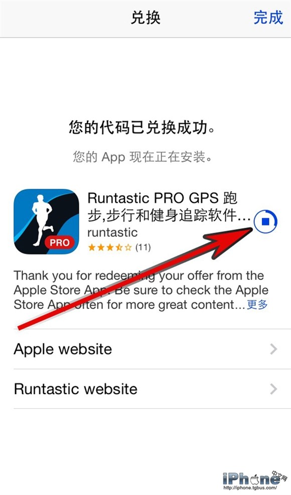 稍等片刻,即可看見「您的代碼已兌換成功」提示頁面。同時你還可以看見應用的安裝進度(如圖)。點擊頁面右上角的「完成」按鈕即可返回至App Store。