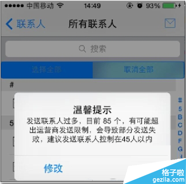 3:接下來就可以選擇你要群發的對象,可以選擇如圖所示的“選擇全部”或者自己一個個勾選,都是沒問題的,選擇好之後就點擊右上角的信息圖標,如圖所示,如果你選擇的群發對象超過45個的話系統會提示你人數過多,所以最好是一次群發45個比較保險。