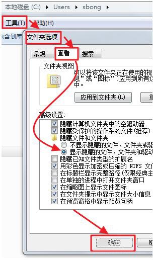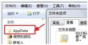 進入個人文件夾後,找到AppData文件夾,如果沒找到這個文件夾,那麼可能是被系統隱藏了,點擊當前文件夾上方的【工具】按鈕,選擇【文件夾選項】-點擊【查看】向下拉滑動條,找到隱藏文件選項,選擇【顯示】-點擊【確定】就找到了AppData文件夾。
