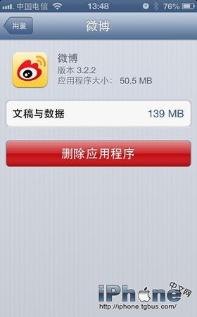 以新浪微博為例,應用程序本身大小50.5MB,文稿與數據139MB,它一共占用了190MB空間。