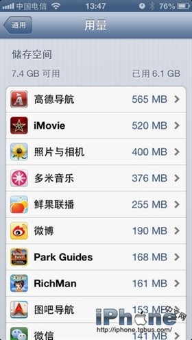 這個列表中,按占用手機存儲空間從高至低排列應用。點開之後會顯示應用程序大小,下面的“文稿與數據”,則是這個應用中的數據占用的機身存儲空間。