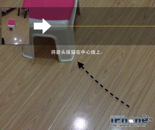 在進入全景拍攝時,還會在屏幕上提示我們”將箭頭保留在中心線上“的操作技巧 。