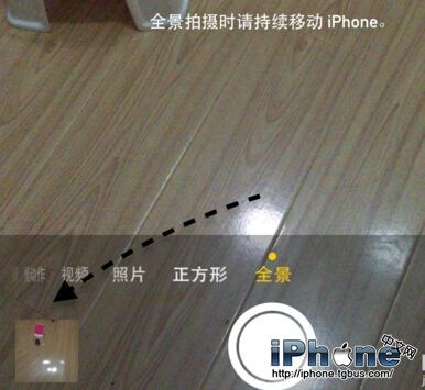 當我們進入全景模式以後,可以看到屏幕上會出現畫中畫,並且還會提示我們在拍攝時請持續移動 iPhone 手機 。點擊底部的”拍照“按鈕,即可開始。