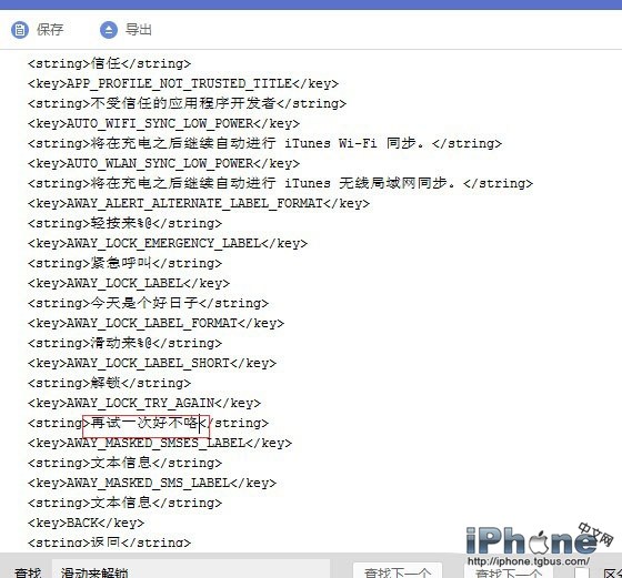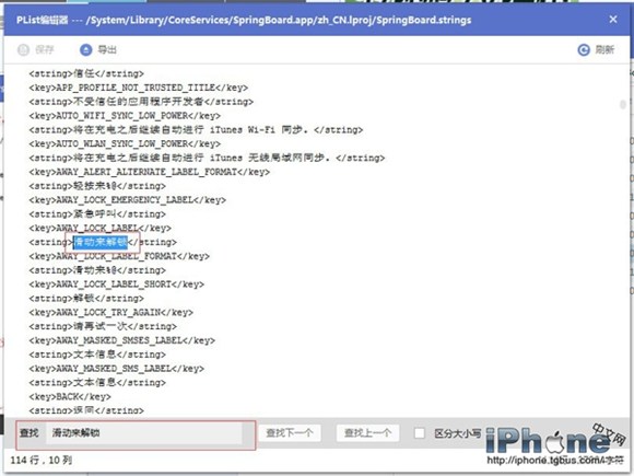 3、找到spingboard.strings ,雙擊編輯,使用查找找到移動滑塊解鎖,找到後替換成立喜歡的文字