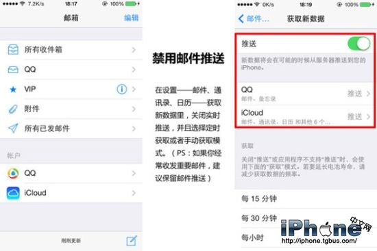 如果“推送”功能一直開著,手機後台運行中就會不斷地等待新郵件,並從服務器上下載。改用“獲取”後,手機就會偶爾連接服務器。實現操作的路徑是進入設置中的郵件、通訊錄、日歷,然後將推送關閉。
