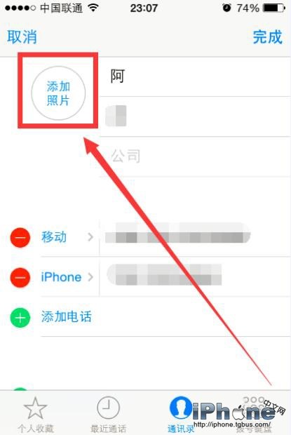 5、在編輯界面的右上角,找到有圓圈中標示“添加照片”四個字的板塊。點擊即為添加照片,用戶可以選擇拍照或是選取一張手機中的照片作為該聯系人的頭像。