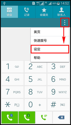 1)打開三星E7撥號界面點擊【三點】選擇【設定】。(如下圖)