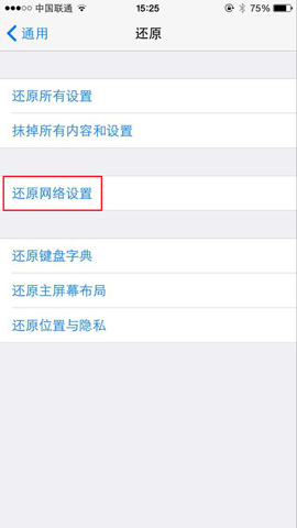 注意:如果以上方法仍然沒有解決問題,可以重置網絡設置。依次進入【設置】—【通用】—【還原】,點擊【還原網絡設置】,系統會自動重啟,重啟完畢後重新連接WiFi即可。
