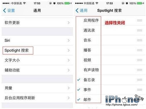 點擊“設置”——“通用”——“Spotlight搜索”,進入菜單之後我們要選擇性的關閉一下不需要在主頁進行搜索的項目,這樣可以有效的節省電量。