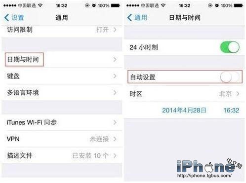 在我們經常使用的顯示日期和時間設置中也存在費電的選項,所以我們要繼續關閉,當然關閉後並不影響使用。打開“設置”——“通用”——“日期與時間”,關閉菜單中的“自動設置”時間選項。