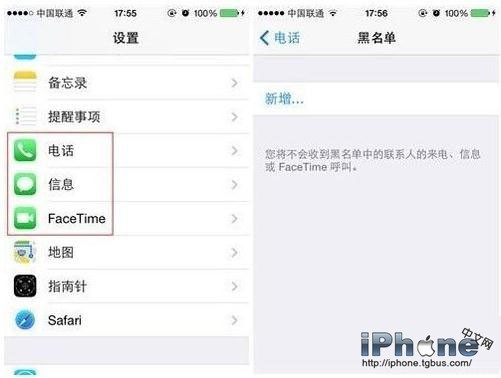 在“設置”——“電話”(或者“短信”、“FaceTime”)中找到“黑名單”可在這三個選項中屏蔽某些陌生號碼的來電和短信。