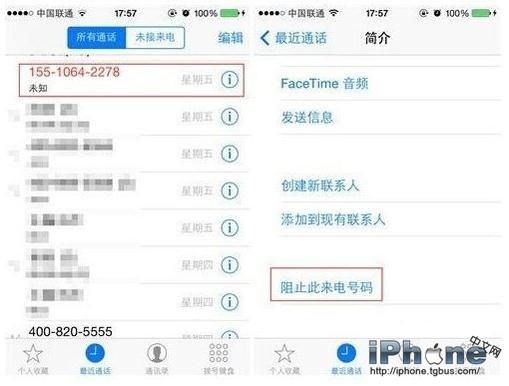 此外,點擊通話記錄或短信記錄後,菜單的後方會出現“i”(圈i),裡面也可選擇“阻止此來電號碼”將其加入黑名單。