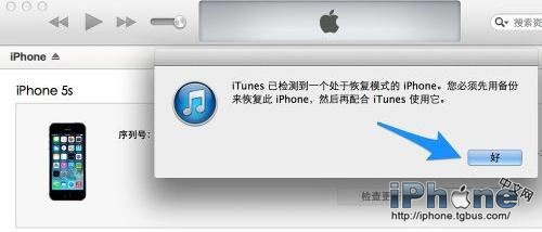 8、如果上面的方法恢復不成功的話,此時iPhone應該是處於系統崩潰的狀態,屏幕上會顯示iTunes連接畫面。這時請先斷開iPhone與電腦的連接,再重新把手機電腦連接起來,隨後iTunes會提檢測到一個處於恢復模式的iPhone 。