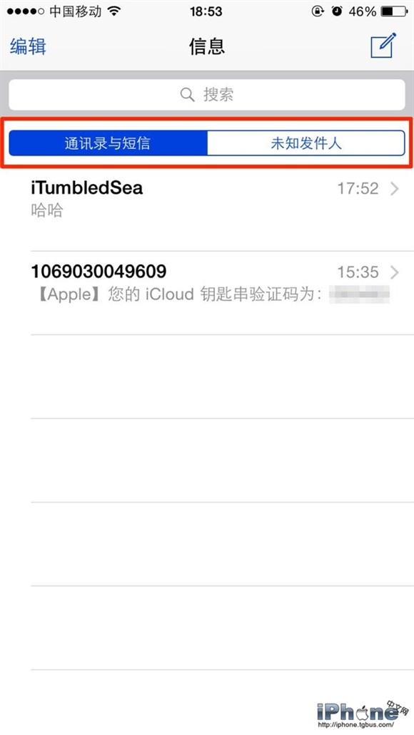 在信息應用程序中,現在收到的信息已經分為兩類:通訊錄與短信、未知發件人。