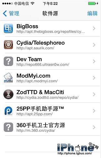越獄後,盡量打上ipa和deb的安裝補丁。然後進入Cydia,在“管理”裡選擇“軟件源":