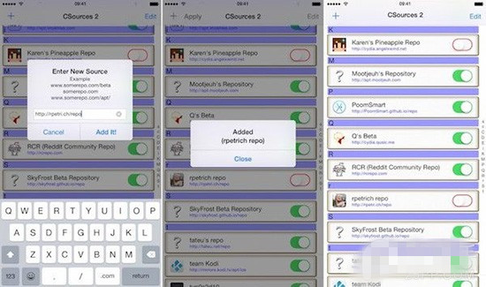 在這個應用裡,你可以點擊左上角的“+”來增加新的源,大致方法和Cydia裡的一樣。添加源後,該源就會出現在源的列表中。