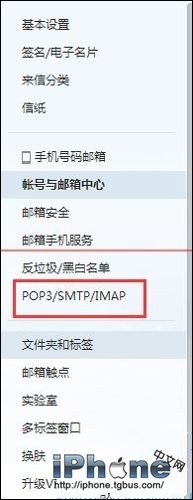 2、單擊“郵箱中心”,此時會看到左側有一項 POP3/SMTP/IMAP,,單擊這一項。