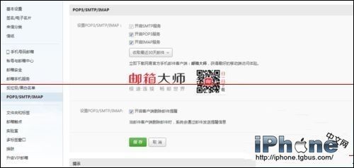 3、單擊後,則會出現一個頁面,我們勾選 “開啟POP3服務” 和“開啟IMAP服務”,單擊 “保存”。
