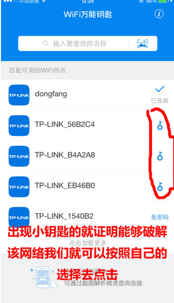 2:安裝WiFi萬能鑰匙,安裝後打開,利用截圖方式來檢測被分享的熱點,軟件會自帶教程,檢測後再通過描述文件來破解最後就成功越過密碼連接到WiFi了,接下來我們就開始查看密碼了。