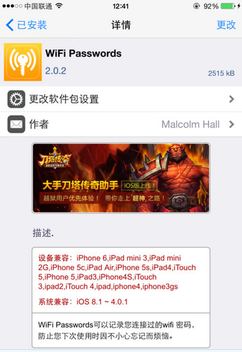 3:進入Cydia添加威鋒源apt.feng.com,然後下載插件“WiFi passwords”:這個插件就是查看已連接過的WiFi密碼了,先安裝插件,然後再桌面點擊打開,就可以查看了