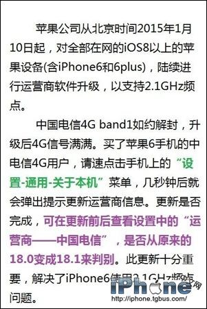 具體來說,iPhone6/6 Plus電信版用戶更新後可查看設置中的“運營商-中國電信”,是否從原來的18.0變為18.1來判別,用戶可以通過點擊“設置-通用-關於本機”更新。