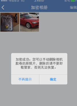 8、這時你的手機管家加密相冊中就會多了這幾張你想隱藏的圖片,然後將手機相冊中的原圖刪除,就可以讓照片只屬於你一個人而不會被偷看到啦。