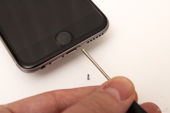 第3步:關掉手機電源,使用工具包裡的五角形螺絲刀擰下螺絲。螺絲刀的頭部很小,但它跟 iPhone 6底部的小螺絲是匹配的。