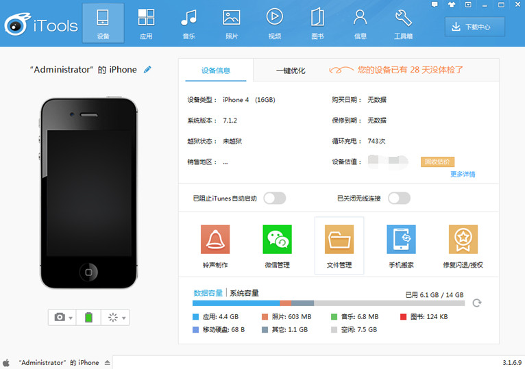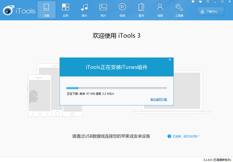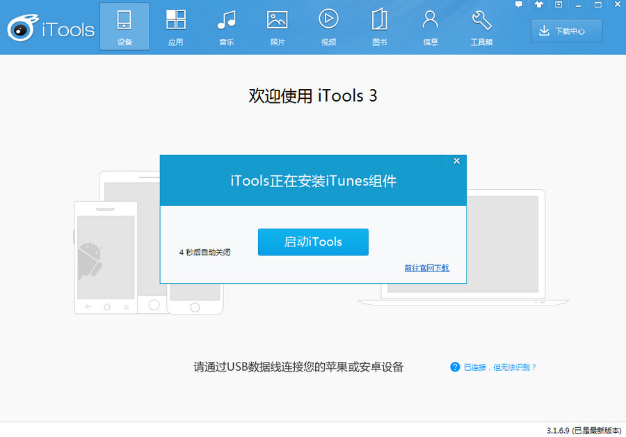 1)將新版iTunes完全卸載後,打開iTools PC端,將設備連接至iTools PC端會提示需要安裝iTunes組件,點擊【一鍵安裝】後會自動下載安裝。(若卸載iTunes組件後未提示“下載iTunes組件”的彈窗,建議您重新前往pc6重新下載最新版安裝)