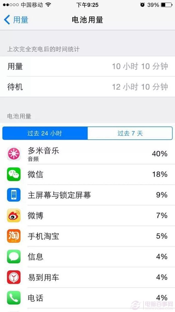設置→通用→用量→電池電量