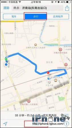 5、如果是步行的話,還可以切換到【步行】選項,之後會顯示具體的步行路線,底部也會顯示大約需要步行的時間與步行的距離,如下圖所示。