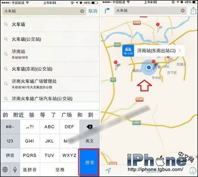 2、然後在頂部的搜索框中,輸入我們需要達到的目的地,然後進行搜索。比如這裡小編要去火車站,然後就搜索火車站,之後就可以在iPhone6地圖上找到,火車站的位置,如下圖所示。