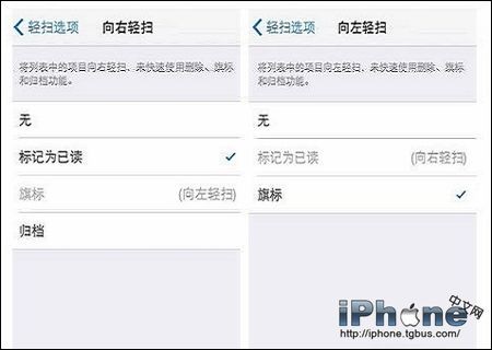 如上圖,大家可以在這裡給向左輕掃手勢指定“標記為已讀”、“旗標”的任務,在向右輕掃手勢中用戶可以選擇“無”、“標記為已讀”、“旗標”以及“歸檔”。同時用戶可以根據自己使用iPhone的手勢習慣,比如你是左撇子、或者你的慣用手是右手等來設定上述手勢,還有就是如果你經常給郵件添加旗標等,那麼設定上述手勢也是非常方便的,希望本文會對那些在使用蘋果設備的朋友們有所幫助。